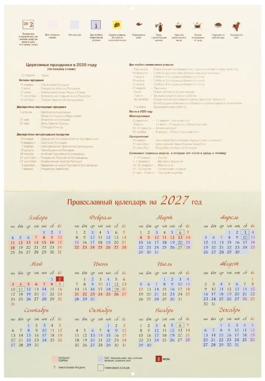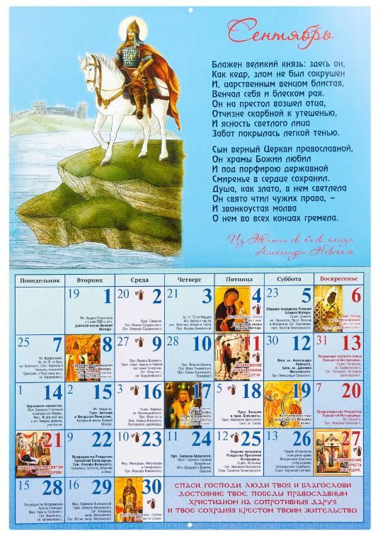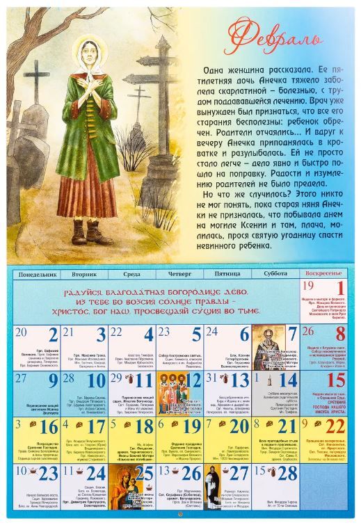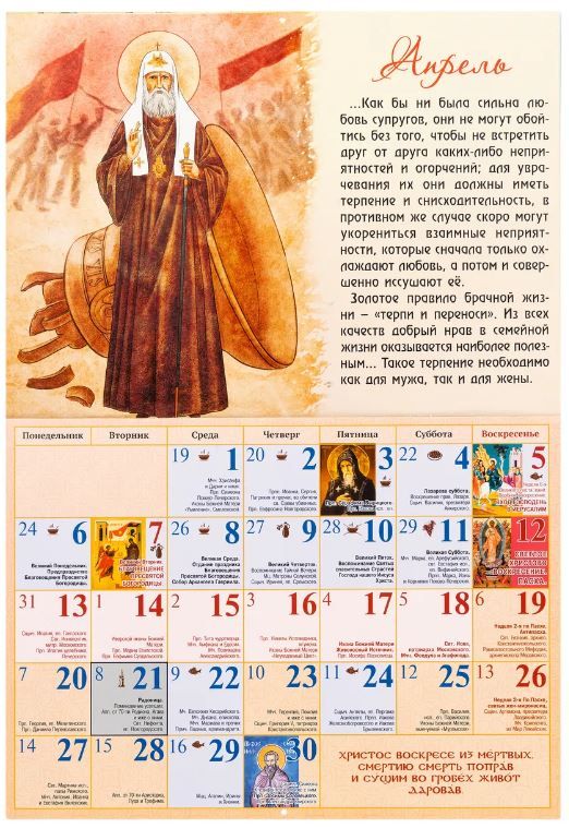 Содержит напоминания о важнейших православных праздниках, постах, календарь трапез. Допущено к распространению Издательским советом Русской Православной Церкви.