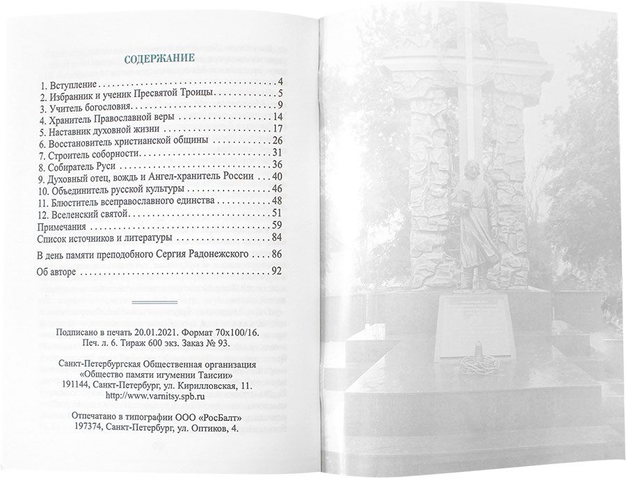 Преподобный Сергий Радонежский, один из самых всенародно любимых русских святых, отличается исключительностью влияния на историю России. Избранник и ученик Пресвятой Троицы, учитель богословия, хранитель православной веры, наставник духовной жизни, восстановитель христианской общины, строитель соборности, собиратель Руси, духовный отец, вождь и ангел-хранитель России, объединитель русской культуры, блюститель всеправославного единства, вселенский святой, крупнейший древнерусский просветитель и пророк, он стал тем особым печальником земли Русской, молитвами которого стоят города. Обильно стяжав благодать Святого Духа, преподобный Сергий сыграл большую роль в возрождение духовных сил русского народа. Монашеский подвиг Сергия в годы ордынского ига служит напоминанием о том, что и в сегодняшние непростые времена России необходим прежде всего духовный труд.