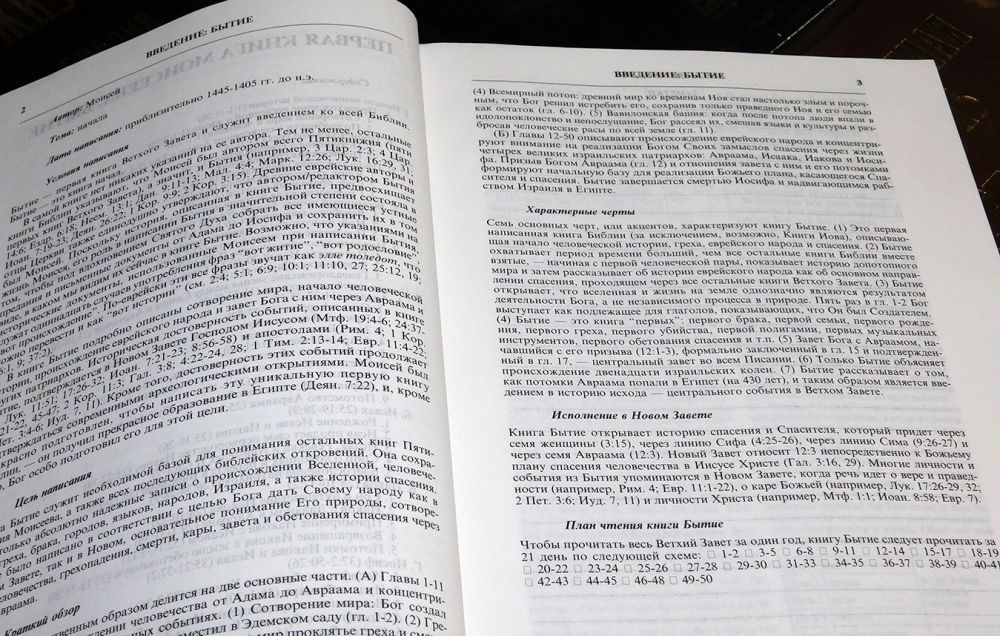 Каждой книге Библии предшествует её краткое содержание (опорный план), характеристика исторических условий написания книги, информация об авторе, обстоятельствах и дате написания, обозначение изначальной цели написания книги, краткое обобщение всего содержания книги, перечень характерных черт, особенностей и основных акцентов книги, предполагаемый план чтения, позволяющий прочитать всю Библию за 2 года.