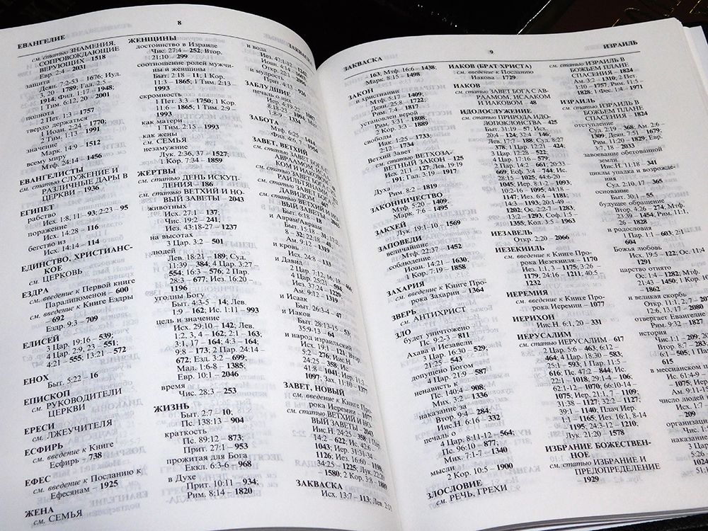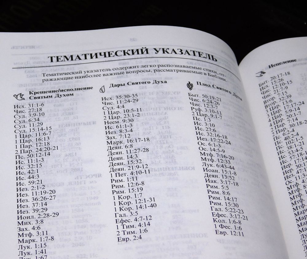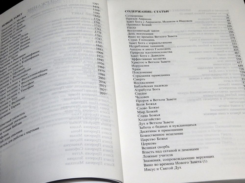 Весь текст Библии сопровождают различные таблицы, схемы и карты. Книга содержит тематический и предметный указатели, тематические символы-обозначения, план систематического чтения Библии и симфонию.