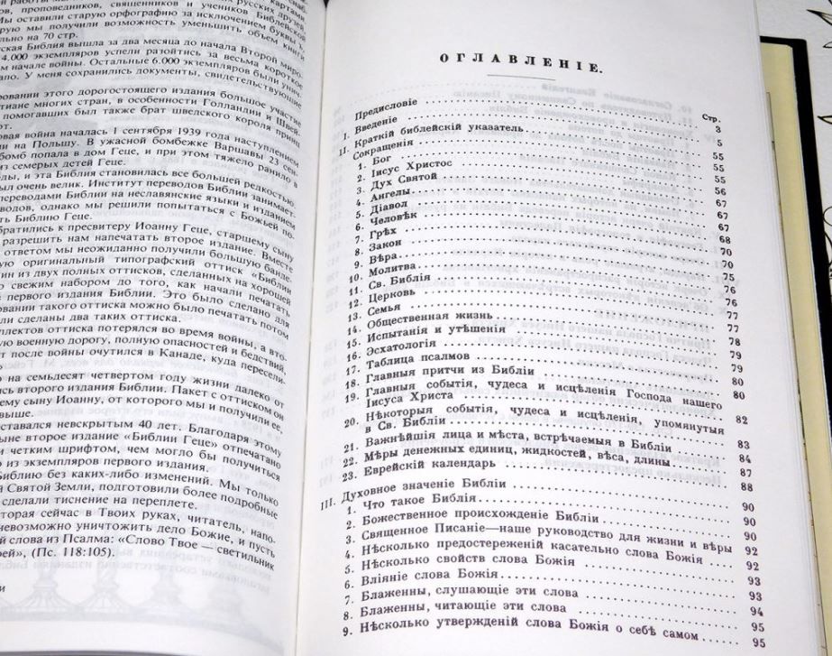 «Более всего я был убежден в том, что Господь возложил на меня задачу издать русскую Библию в новой обработке, напечатанную ясным и легким для чтения шрифтом. И менее всего я мог представить себя способным справиться со столь огромной и важной работой. Мы с несколькими сотрудниками занимались подготовкой этого издания, никому не сообщая о нашей работе. И лишь когда рукопись была уже готова к печати, мы выступили с ней открыто. Речь не шла о новом переводе Библии, мы изменили только несколько устаревших выражений. Отдельные главы разделили подзаголовками соответственно изданиям Библии на других языках и дополнили ее многими ссылками на параллельные места. Особенно важные стихи набрали жирным шрифтом. Кроме того. Библия была снабжена объяснительными примечаниями и цветными географическими картами. В ходе этой работы мы пользовались советами наших русских друзей, миссионеров, проповедников, священников и учеников Библейской школы... Мы оставили старую орфографию за исключением буквы ъ, изъяв которую мы получили возможность уменьшить объем книги приблизительно на 70 стр. Новая русская Библия вышла за два месяца до начала Второй мировой войны (т.е. в 1939 г.). 4.000 экземпляров успели разойтись за весьма короткое время в самом начале войны. Остальные 6.000 экземпляров были уничтожены гестапо. У меня сохранились документы, свидетельствующие об этом».