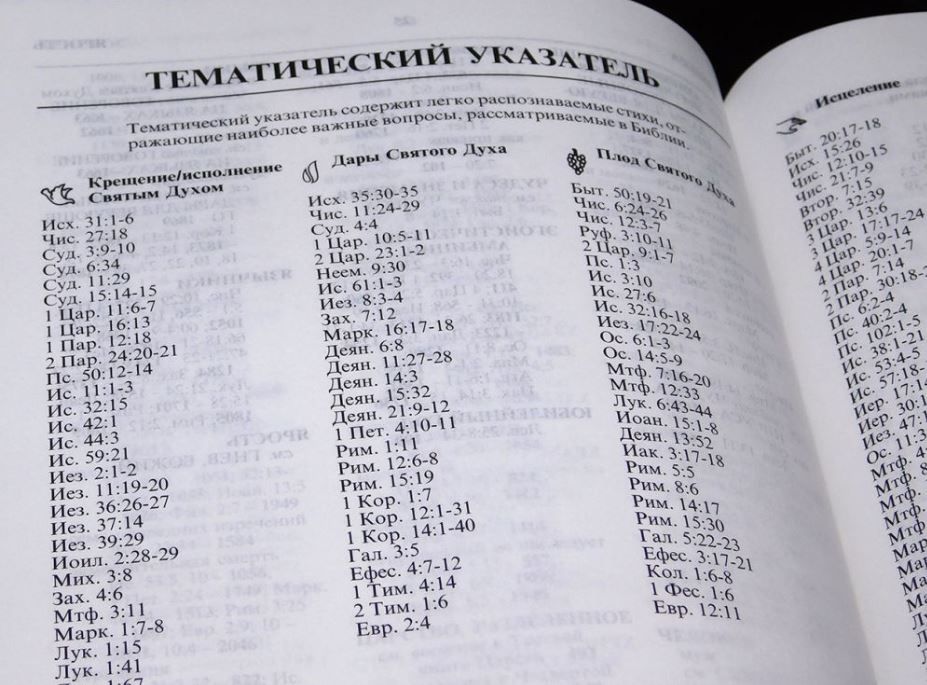 Весь текст Библии сопровождают различные таблицы, схемы и карты. Книга содержит тематический и предметный указатели, тематические символы-обозначения, план систематического чтения Библии и симфонию.