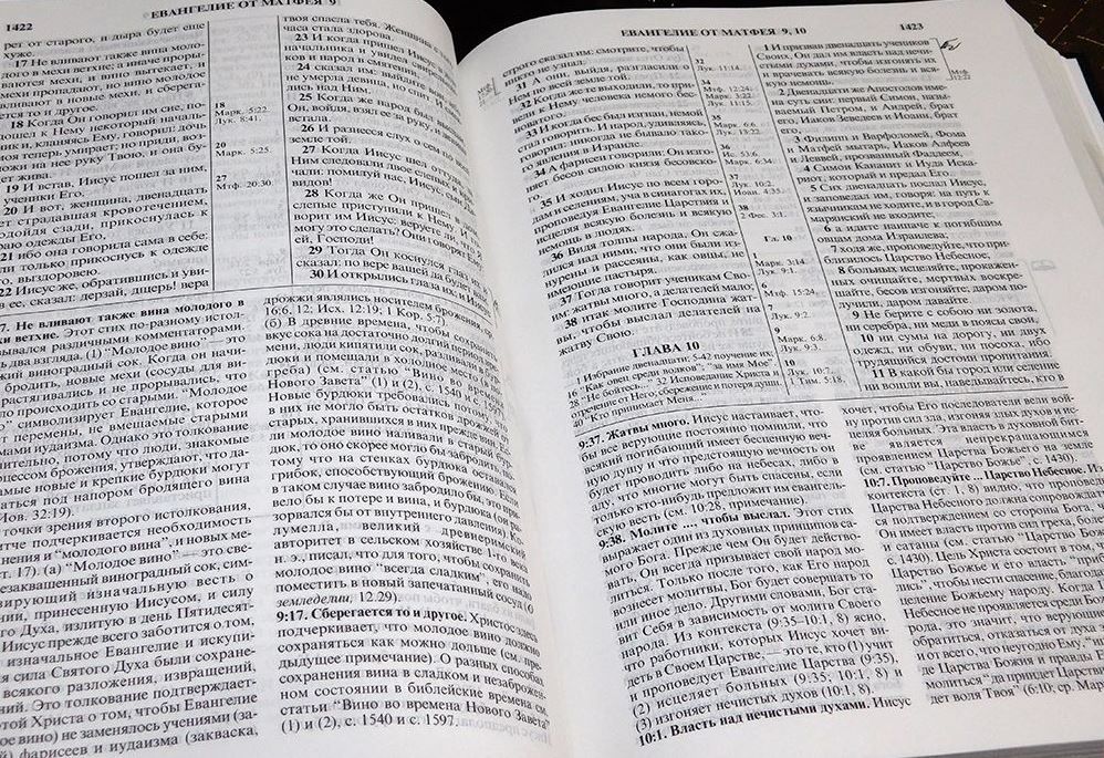 Весь текст Библии сопровождают различные таблицы, схемы и карты. Книга содержит тематический и предметный указатели, тематические символы-обозначения, план систематического чтения Библии и симфонию.