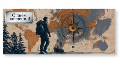 Именно для таких случаев и выпускаются нарядные конверты для денег. Этот конверт «С днем рождения» предназначен для подарков мужчине. Конверт двухсторонний: с одной стороны – изображение мужчины в походной одежде с рюкзаком, карты, компаса, парусника. А также надпись: «С днем рождения!» На другой стороне конверта – изображение карты, компаса.