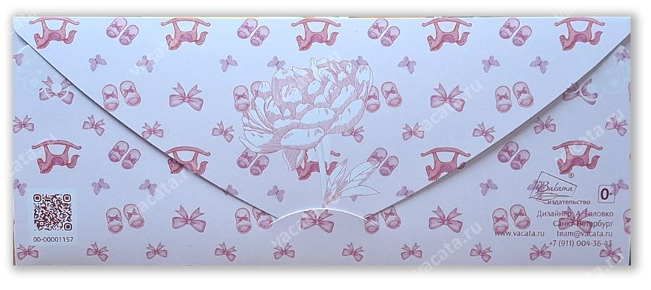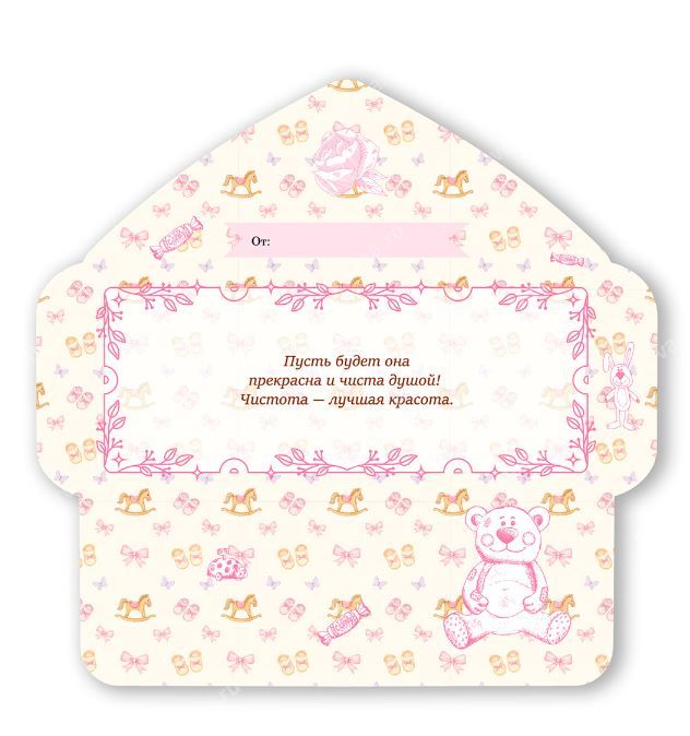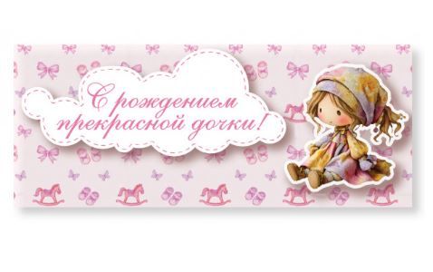 Именно для таких случаев и выпускаются нарядные конверты для денег. Этот конверт «С рождением прекрасной дочки» предназначен для подарка родителям маленькой девочки. Конверт двухсторонний: с одной стороны – изображение маленькой девочки, лошадок, бабочек... А также надпись: «С рождением прекрасной дочки!» На другой стороне конверта – изображение медвежонка, лошадок и конфет.