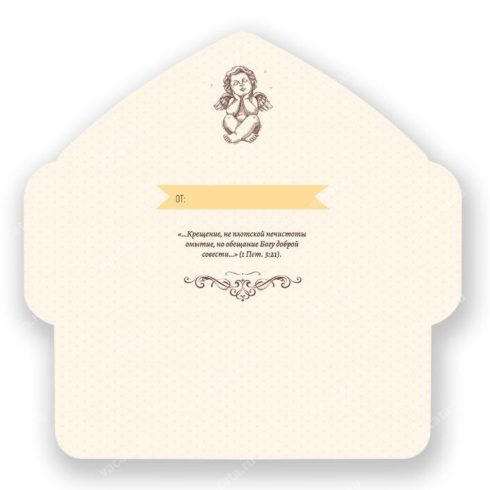 Конверт для денег «С крещением» создан нами специально для таких случаев. Конверт двухсторонний: с одной стороны – изображение креста в терновом венце и лучей исходящего от него света. А также надпись: «Конверт для денег «С крещением»!» На другой стороне конверта – изображение ангела и орнамента.