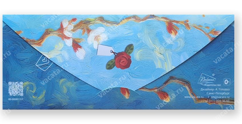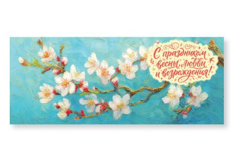 Конверт для денег «С праздником весны, любви и возрождения» создан нами специально для таких случаев. Конверт двухсторонний: с одной стороны – изображение цветущих веток на фоне весеннего голубого неба. А также надпись: «С праздником весны, любви и возрождения!» На другой стороне конверта – также изображение цветущих веток на фоне весеннего голубого неба, но других.
