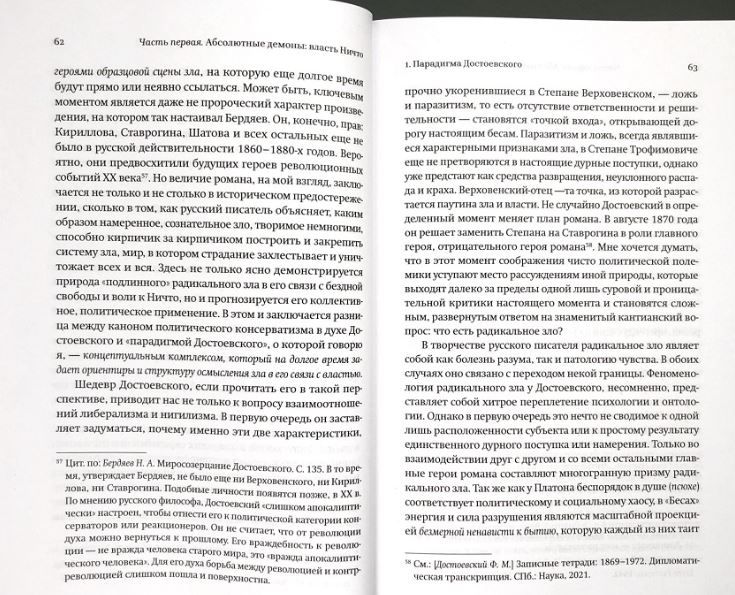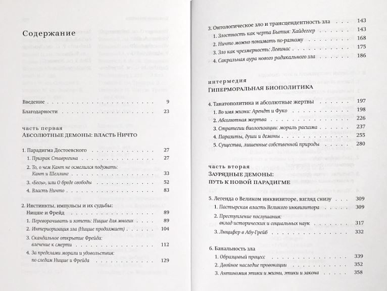 Пока нас волнует страдание в мире, утверждает политический философ Симона Форти, мы вынуждены исследовать вопрос о зле. Автор рассматривает философские дебаты XIX–XX вв. о природе зла и делает вывод о необходимости отказаться от «парадигмы Достоевского», в которой всемогущий субъект (демон, сеятель смерти) противопоставлен беспомощным жертвам. Она предлагает новую генеалогию отношений между злом и властью. Форти обращает внимание на пассивное отношение к следованию правилам, потребность в нормальности и желание подчинения, свойственные нынешним демократиям, что и составляет, по ее мнению, основу современного зла. Зло рассматривается также в связи с нашей потребностью в выживании любой ценой и глубоким желанием признания. Книга вызвала широкую дискуссию, предложив новые пути исследования взаимоотношений этики и политики.