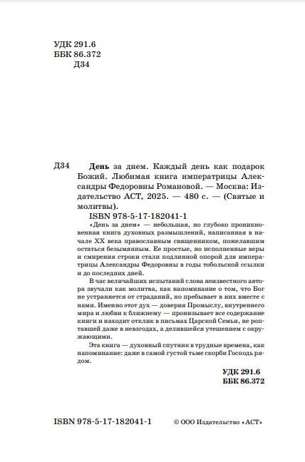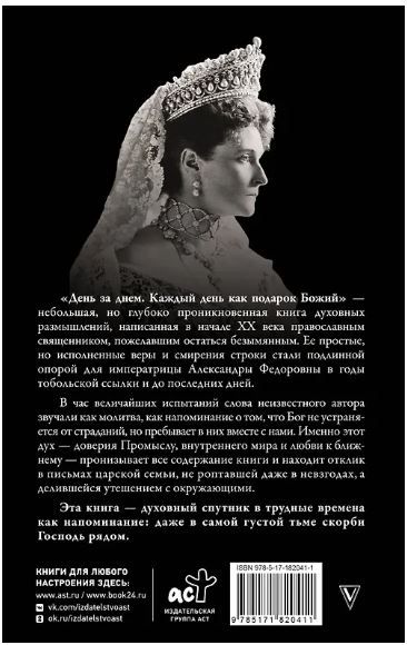 "День за днем. Каждый день как подарок Божий" — небольшая, но глубоко проникновенная книга духовных размышлений, написанная в начале XX века православным священником, пожелавшим остаться безымянным. Ее простые, но исполненные веры и смирения строки стали подлинной опорой для императрицы Александры Федоровны в годы тобольской ссылки и до последних дней.