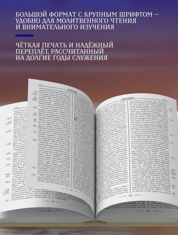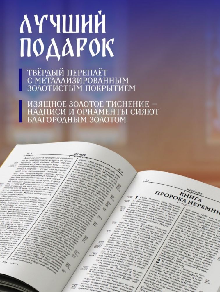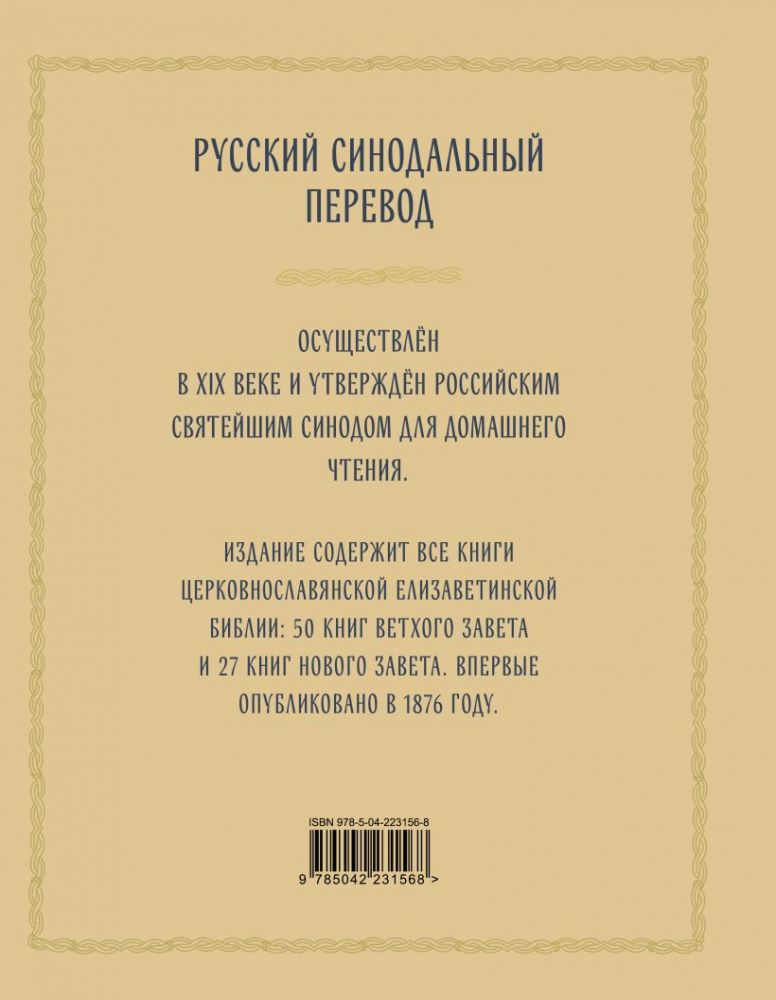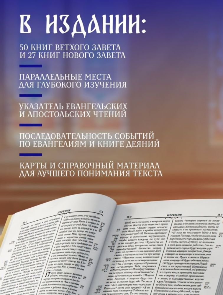 Полная Библия в русском Синодальном переводе. 50 книг Ветхого Завета и 27 книг Нового Завета. С указателем евангельских и апостольских церковных чтений, последовательностью евангельских событий по четырем евангелистам, последовательностью событий по книге Деяний святых апостолов, картами и другими приложениями.