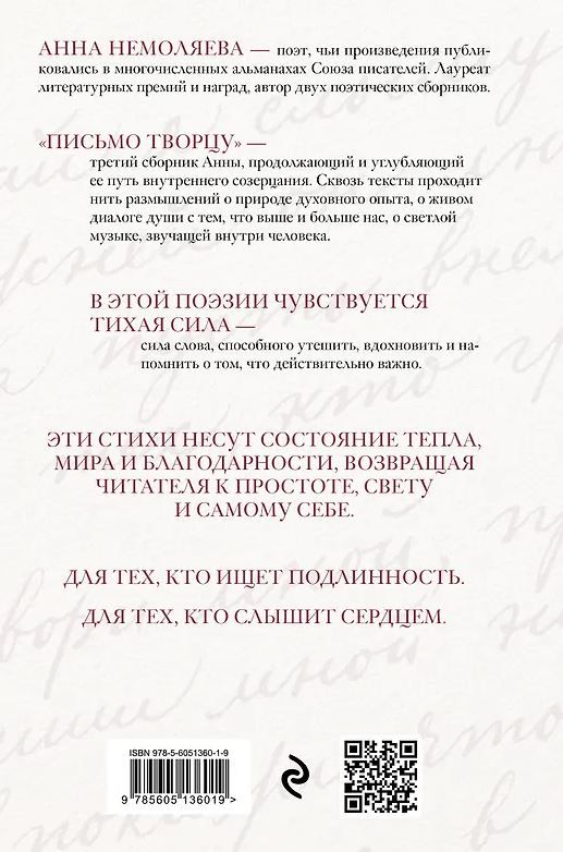 «Письмо Творцу» — третий сборник Анны, продолжающий и углубляющий ее путь внутреннего созерцания. Сквозь тексты проходит нить размышлений о природе духовного опыта, о живом диалоге души с тем, что выше и больше нас, о светлой музыке, звучащей внутри человека.