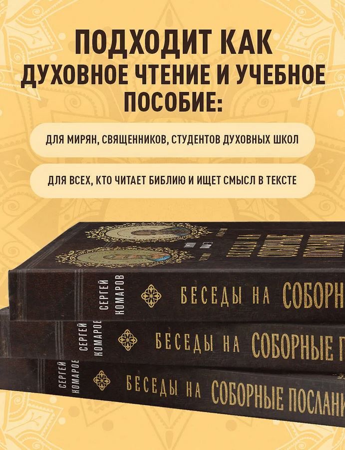 Великолепное современное толкование на Соборные послания. Семь посланий Нового Завета, именуемых «соборные» — послание апостола Иакова, два послания апостола Петра, три послания апостола Иоанна, послание Иуды, — являются неотъемлемой частью Библии. Они оказали значительное влияние на развитие христианского богословия. Однако эти тексты, ежедневно по зачалам читаемые в Церкви, остаются малопонятными даже для воцерковленных христиан. Книга Сергея Комарова на высоком уровне говорит об особенностях каждого из семи соборных посланий, раскрывает их богословскую и нравственную проблематику и находит в них темы, актуальные для современных людей. Она написана живым и доступным языком, понятным для широкой читательской аудитории. Сергею Комарову удается сочетать популярную манеру изложения с содержательной глубиной, в том числе благодаря обращению к толкованиям святых отцов Православной Церкви.