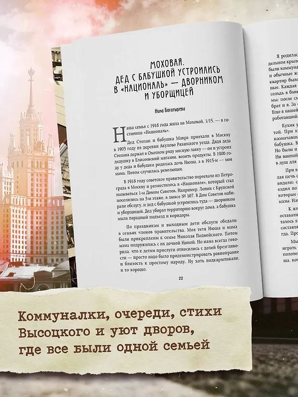Эта книга — уникальная коллекция подлинных историй москвичей, проживших советскую эпоху. Здесь нет выдумки: только память, запахи, звуки и детали, которые невозможно придумать. Как уместить четыре поколения в 16 метрах? Как делили ванну с соседями и почему у каждого был свой тазик? Как звучали дворы Москвы 40-х, 60-х и 80-х?