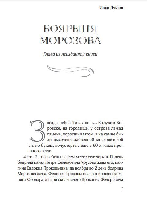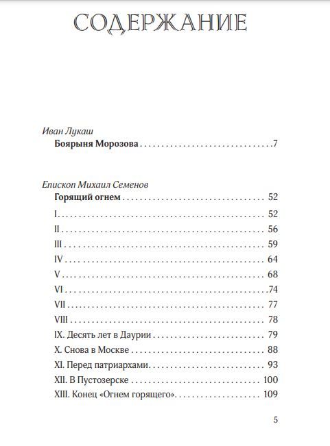 Сборник открывается повестью о протопопе Аввакуме — исповеднике старообрядчества, почитаемом как священномученик. Его подвиг задаёт контекст, на котором раскрываются судьбы его ближайших сподвижниц: боярыни Феодосии Морозовой, её сестры княгини Евдокии (Марфы) Урусовой и Евдокии Уруслановой. Все они стали жертвами церковного раскола и приняли мученическую смерть, оставаясь верными древнему благочестию.