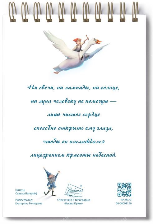 Подойдет как для деловых заметок, так и для набросков своих мыслей, идей, заметок на духовные темы или записи молитвенных нужд. Блокнот А6 «Никогда не отчаивайся» был вдохновлен сказкой Сельмы Легерлёф «Чудесное путешествие Нильса с дикими гусями». Изначально задумавшееся как произведение для младших школьников по географии Швеции, в конце концов оно стало самым читаемым в Скандинавии. Показав страну в восприятии ребенка и оригинально соединив в одном произведении географию и сказку, Лагерлёф вселила жизнь и краски в сухой школьный урок. Сюжет сказки не является христианским, однако она учит маленьких читателей читателей стойкости духа, верности друзьям и самоотверженности. Мы надеемся, что блокнот особенно заинтересует детей и подростков, однако не хотели бы ограничивать потенциальных покупателей только этой категорией.