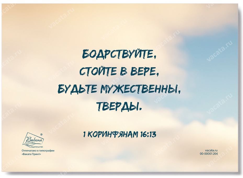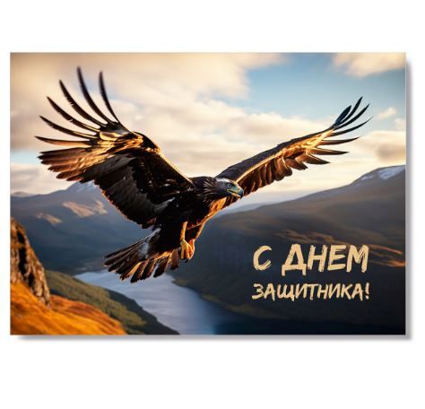 Открытка с мотивирующей цитатой из Библии предназначается мужчинам, защитникам своих близких. На открытке изображен парящий в горах орел, который символизирует духовную мощь и стойкость в вере, качества подлинного мужчины.