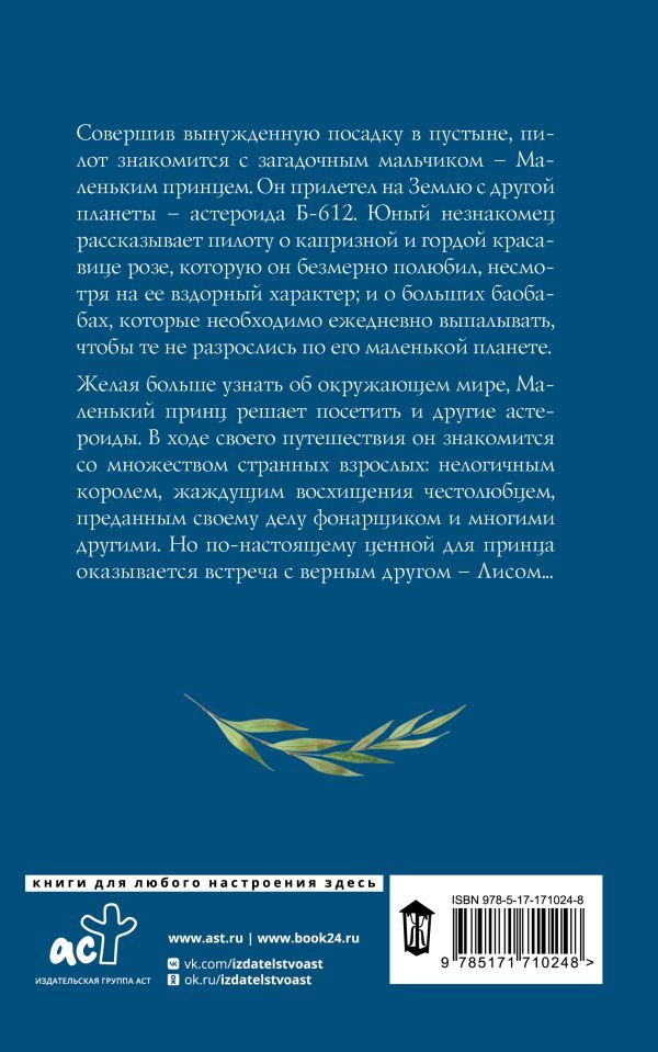 - «Маленький принц» — самая известная повесть французского писателя Антуана де Сент-Экзюпери, опубликованная в 1943 г. Книга переведена на 300+ языков и диалектов и продана тиражом свыше 200 миллионов экземпляров, что делает ее одной из самых издаваемых в мире после Библии.