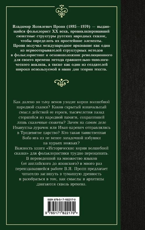 – Книга «Исторические корни волшебной сказки» показывает, что волшебная народная сказка появилась из реальной жизни: древних обрядов, мифов и представлений о мире, которые со временем превратились в сюжеты про Ивана-дурачка, Ивана-царевича, Бабу Ягу и Тридевятое царство.