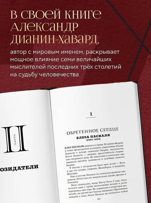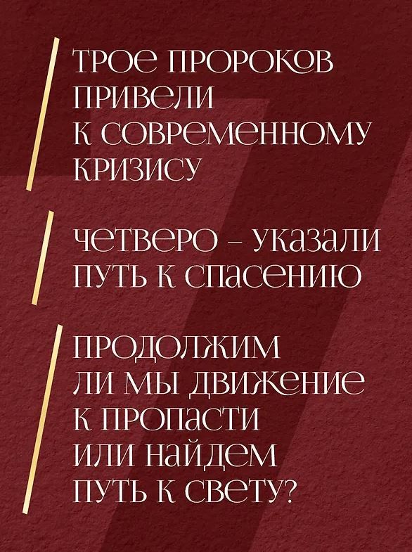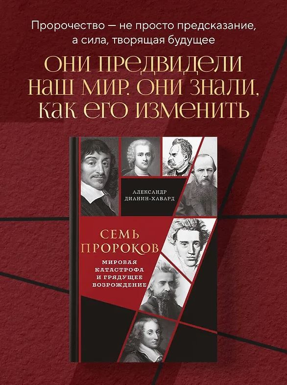 По мнению автора, пророки не только предсказывают будущее, но способны его, это самое будущее, либо созидать, либо разрушать. Александр Дианин-Хавард исследует жизнь и наследие семи величайших философов последних трёх столетий, предвещавших будущие великие потрясения. Трое из них — Декарт, Руссо и Ницше — своими идеями и концепциями способствуют катастрофе, четверо — Паскаль, Кьеркегор, Достоевский и Соловьёв — предвещают те же самые потрясения, но указывают пути их преодоления. Каждый из этих семи пророков — разрушитель или созидатель, и это напрямую касается нашей жизни.