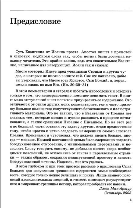 В этом комментарии я старался избегать многословия и говорить только о том, что непосредственно помогает понимать текст. В книге мало отступлений и нет попыток приукрасить ее содержание. Это отличается от стиля других моих комментариев, где я часто привожу большое количество сопутствующего богословского и иллюстративного материала. Это не значит, что в Евангелии от Иоанна нет славных тем, которые можно и нужно развивать в процессе истолкования, а также сравнивая Писание с Писанием. Но на этот раз я по большей части оставил эту задачу другим, отдав предпочтение тому, чтобы кратко и четко следовать намерениям самого апостола Иоанна. Временами я чувствовал, что должен писать больше, иногда — меньше. Но моей постоянной целью было сдержанно подавать богодухновенное откровение, с минимальными перерывами, и позволять Слову говорить самому, не добавляя ничего сверх необходимых пояснений, не отклоняясь от текста в параллельные отрывки — таким образом, сохраняя незамутненной простоту и ясность богодухновенной истины. Надеюсь, мне это удалось.
