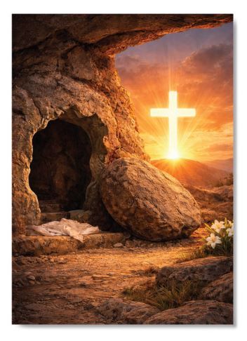Открытка "Свет Воскресения..." передает атмосферу светлого праздника и возрождения. На лицевой стороне изображена яркая сцена с воскресением Иисуса: пещера и светящийся крест, олицетворяющий надежду и новый день. Сочные, теплые оттенки создают ощущение умиротворенности и торжественности.