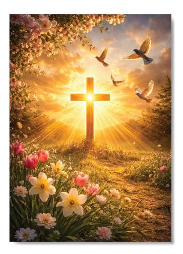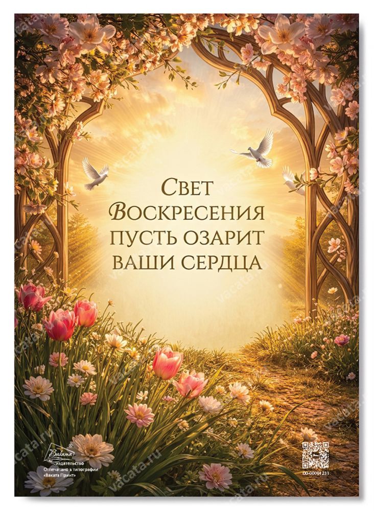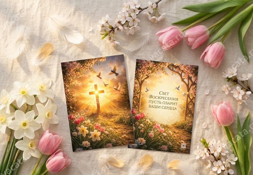 Пасхальная открытка «Пусть озарит ваши сердца» с изображением птиц, цветов и креста в центре композиции на фоне восходящего солнца сделана нами для того, чтобы вы могли поздравить друзей и близких с самым важным христианским праздником. Пасха символизирует собой надежду на преображение нашей поврежденной человеческой природы, на избавление от греха и тлена, от смерти и страданий. Если воскрес Христос, воскреснем и мы, уверовав в Него.