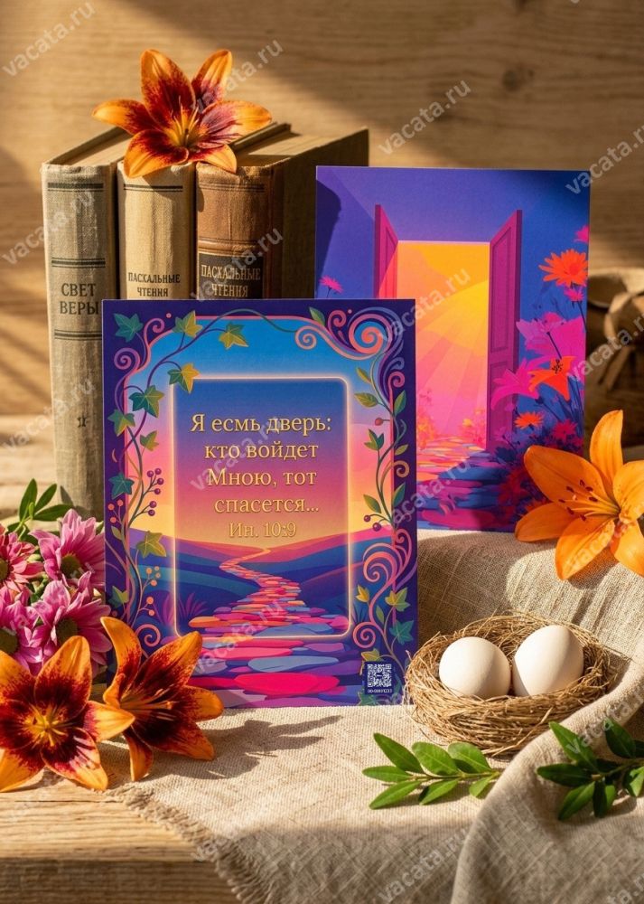Пасхальная открытка «Я есмь дверь» с изображением открытой двери, через которую светит свет, сделана нами для того, чтобы вы могли поздравить друзей и близких с самым важным христианским праздником. Христос сказал о Себе: «Я есмь дверь...», что символизирует путь к спасению, который Он дает. Пасха же символизирует собой надежду на преображение нашей поврежденной человеческой природы, на избавление от греха и тлена, от смерти и страданий. Если мы примем Христа как путь к спасению, мы тоже воскреснем.