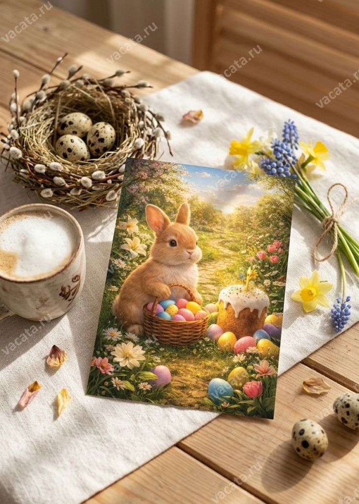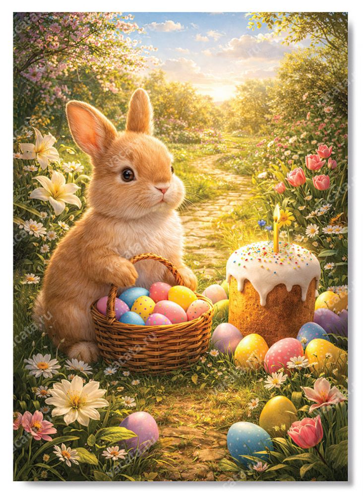 На открытке для детей «Светлой Пасхи. Кролик с корзинкой» изображен кролик с корзинкой, наполненной разноцветными пасхальными яйцами. Также в композицию включены цветущий весенний луг и пасхальный кулич со свечой. Традиционные символы празднования Пасхи на этой карточке создают настрой на весну, обновление жизни, радость бытия. Все эти атрибуты помогут ребенку понять значение праздника, которое родители или другие взрослые могут объяснить ему более подробно.
