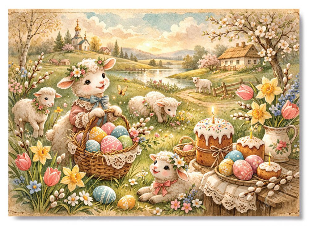 На открытке для детей «Овечка с корзинкой» изображены овечки, одна из которых держит корзинку с пасхальными яйцами. Также в композицию включены стол с куличами и яйцами, весенний пейзаж и здание храма на заднем фоне. Традиционные символы праздника на этой карточке создают настрой на радость бытия и обновление жизни. Все эти атрибуты призваны помочь ребенку настроиться на праздник, смысл и значение которого родители или другие взрослые могут объяснить ему более подробно.