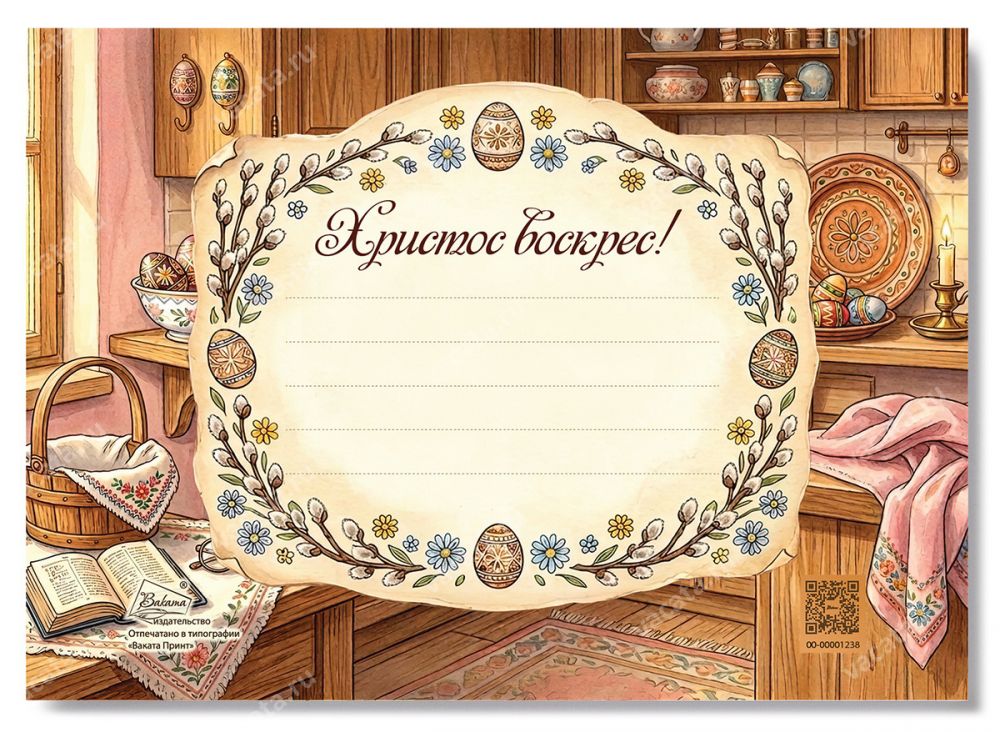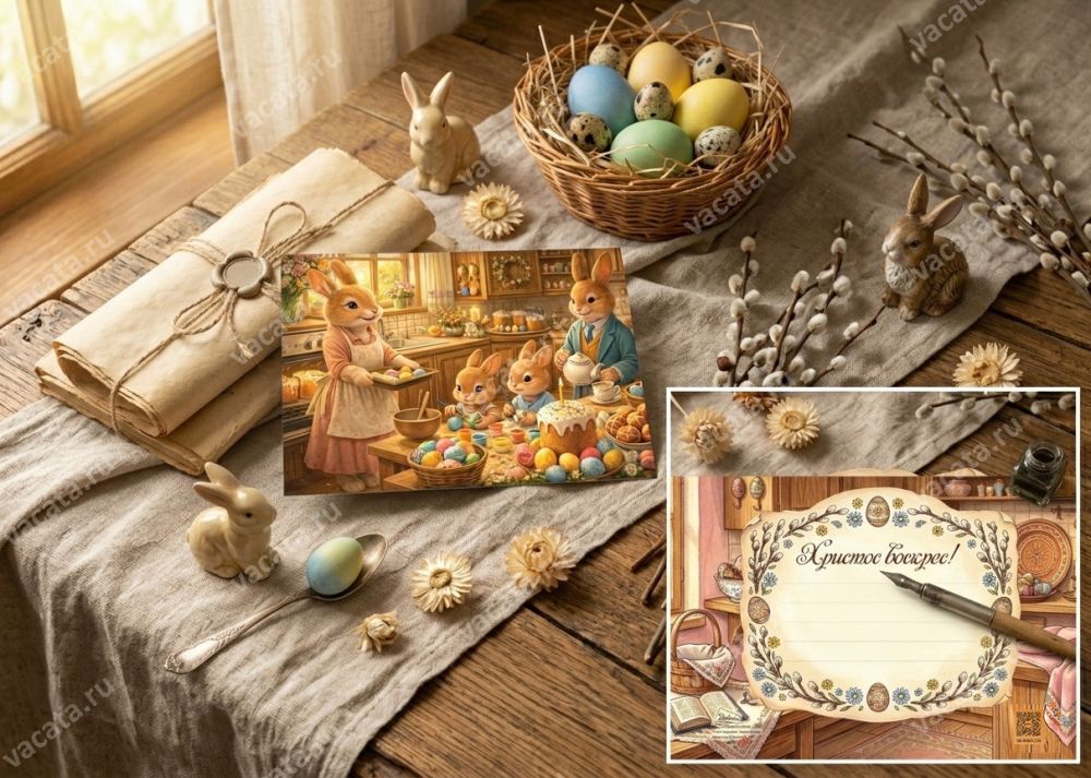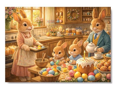 На открытке для детей «Христос воскрес». Семья зайчат» изображено семейство зайцев, празднующих Пасху. Мама-зайчиха держит поднос с пасхальными яйцами, папа-заяц разливает чай, а дети-зайчата раскрашивают яйца. Также в композицию включены стол с куличами и яйцами. Традиционные символы праздника на этой карточке создают настрой на радость бытия и обновление жизни. Все эти атрибуты призваны помочь ребенку настроиться на праздник, смысл и значение которого родители или другие взрослые могут объяснить ему более подробно.