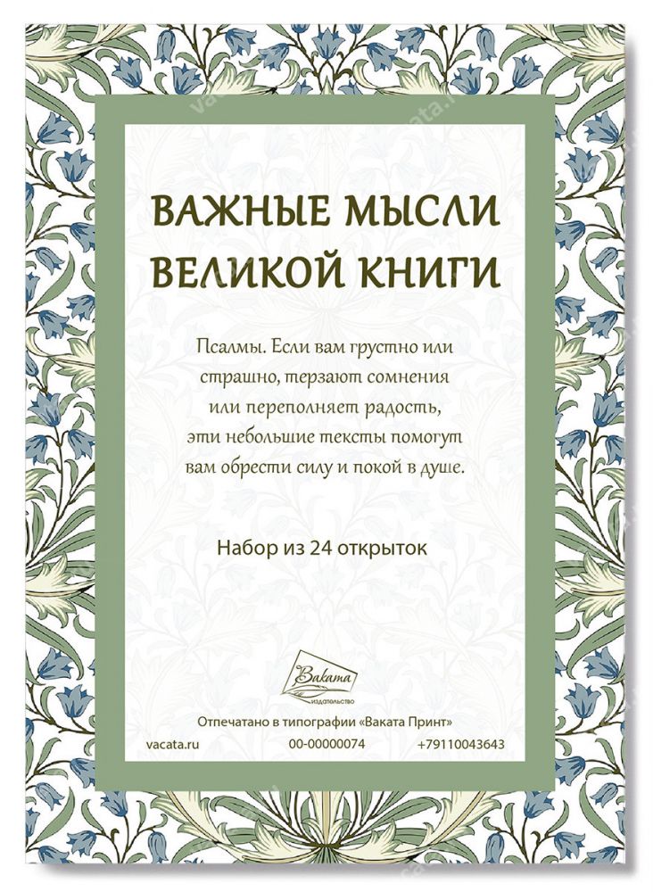 Комплект из 24 открыток с текстами псалмов «Важные мысли великой книги». Если вам грустно или страшно, терзают сомнения или переполняет радость, эти небольшие тексты помогут вам обрести силу и покой в душе.