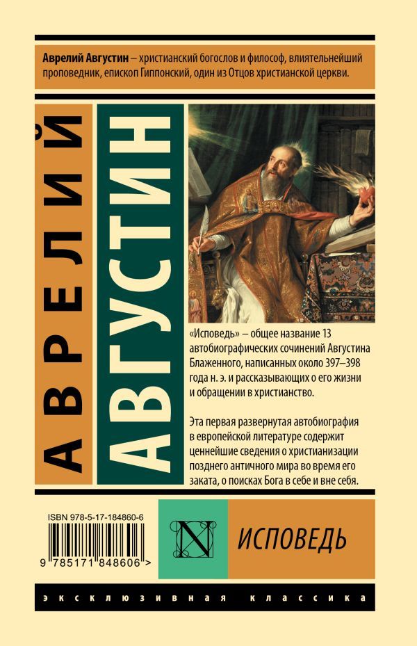 – «Исповедь» Августина Аврелия — веха мировой литературы и богословской мысли, первая развернутая автобиография в европейской традиции, состоящая из 13 автобиографических сочинений. Написанная около 397–398 года н. э., книга рассказывает о духовном пути автора и его обращении в христианство.
