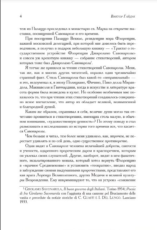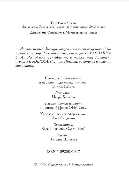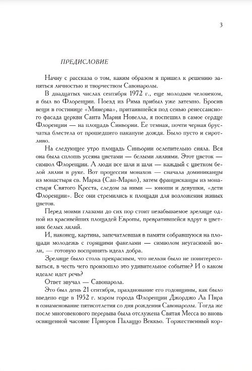 И по сей день, спустя 500 лет после трагической смерти Савонаролы, его личность пo-прежнему вызывает огромный интерес и порождает множество вопросов. Впрочем, многое в его жизни представляется бесспорным — например, то, что она целиком была посвящена самоотверженному служению Христу — вплоть до смертной казни во Флоренции, в городе, обязанном о. Джироламо своим спасением…