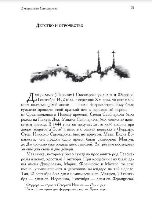 Первая часть книги, `Жизнеописание`, представляет собой биографию доминиканского монаха, научно обоснованную и вместе с тем ярко изложенную итальянским автором Тито С.Ченти.