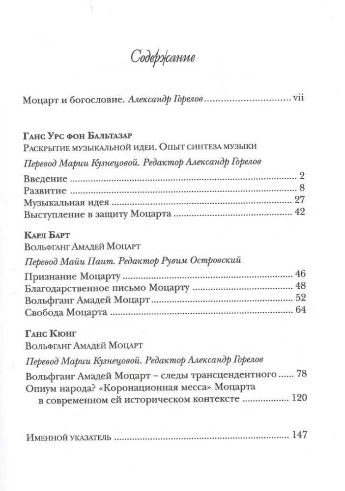 Настоящая книга содержит размышления о Моцарте трех авторов, весьма значимых для западной богословской мысли XX века. Это протестант Карл Барт и два католика — Ганс Урс фон Бальтазар и Ганс Кюнг. Все трое — уроженцы Швейцарии, пишущие на немецком языке Церкви, в том числе и современной.