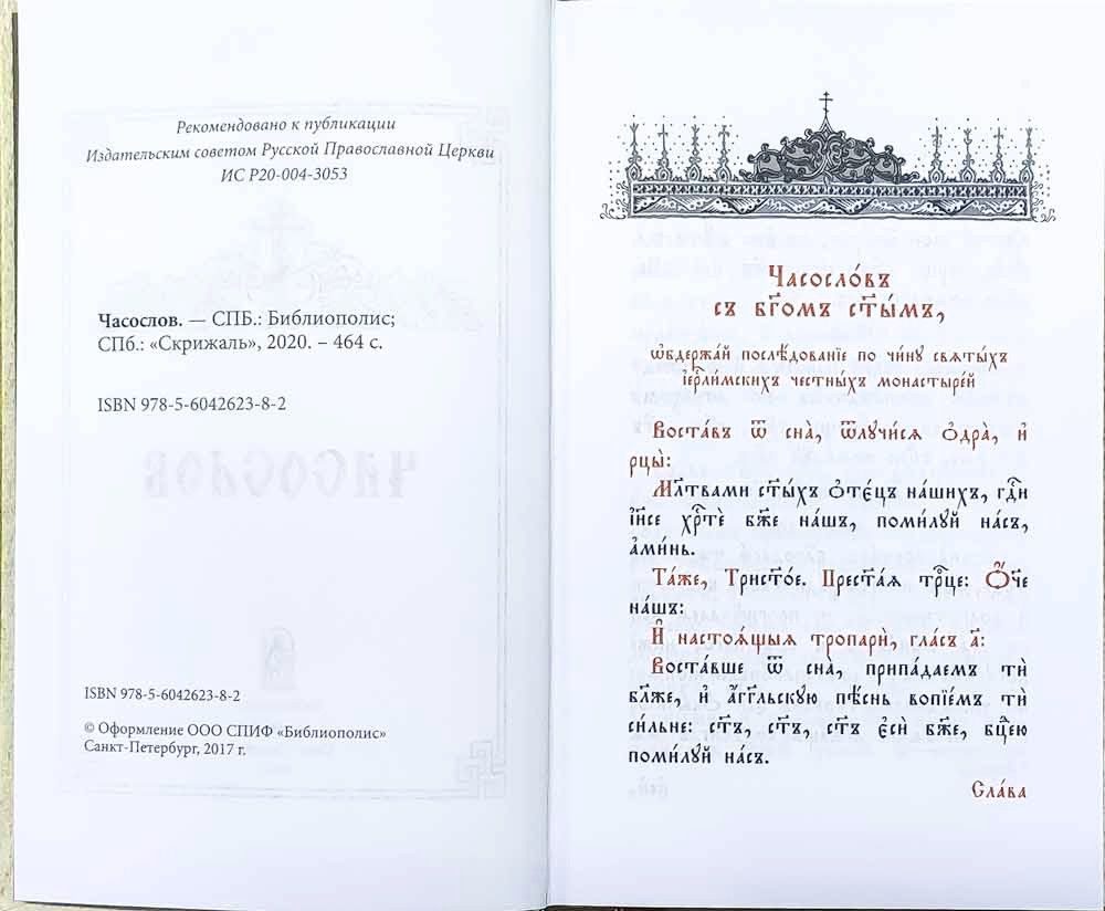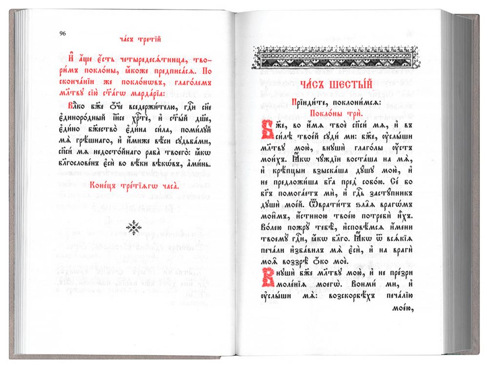 Содержит последования часов, утрени, вечерни, малого и великого повечерия, полунощницы с текстом 17 кафизмы, читаемой во время вседневной полунощницы. Издание дополнено многочисленными тропарями и кондаками Спасителю, Пресвятой Богородице и святым, а также из Постной и Цветной Триодей, и последованием во Святою Неделю Пасхи.
