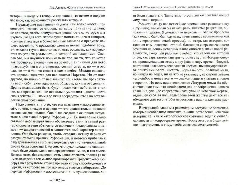 Не надо думать, что последние времена близки или, наоборот, что конец света настанет еще не скоро. Прочитавший книгу Джеймса Алисона поймет, что последние времена уже наступили и от него самого зависит, найдет ли он свой путь на небо и будет ли он там рядом с Христом на стороне агнцев, тех, кто сам стал жертвой или встал на сторону жертв, изгоев этого мира.