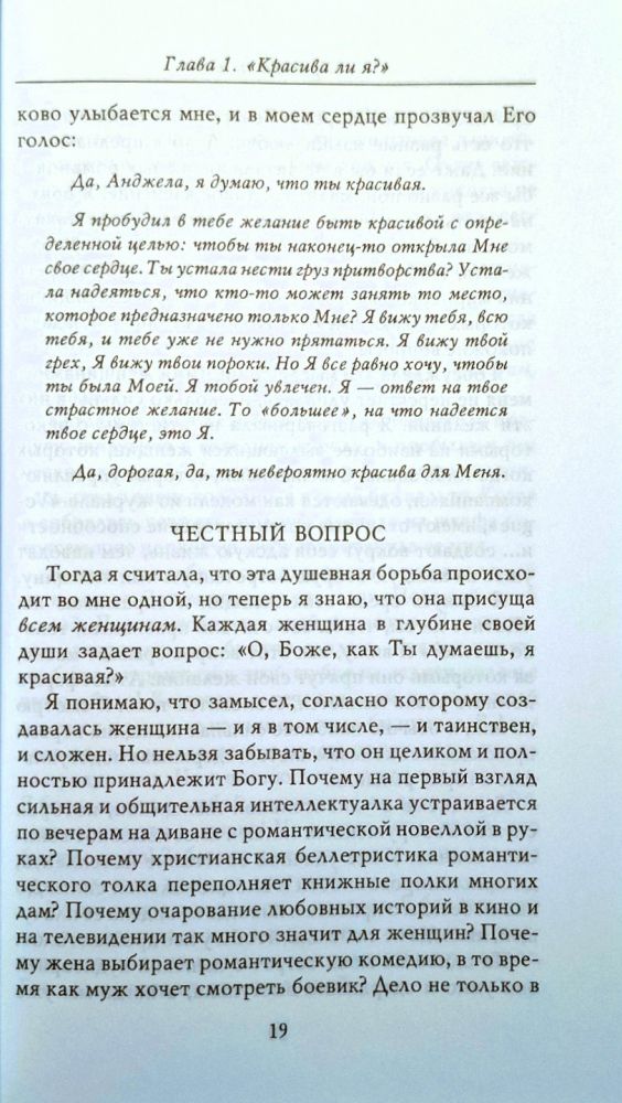 Этот вопрос волнует любую женщину независимо от возраста и социального положения. На страницах предлагаемой вашему вниманию книги Анджела Томас помогает найти на него ответ. Она раскрывает читательницам секрет страстных желаний их сердец и убеждает, что только Иисус Христос способен удовлетворить эти желания, ибо Он - Тот, Кто считает каждую женщину несказанно красивой.