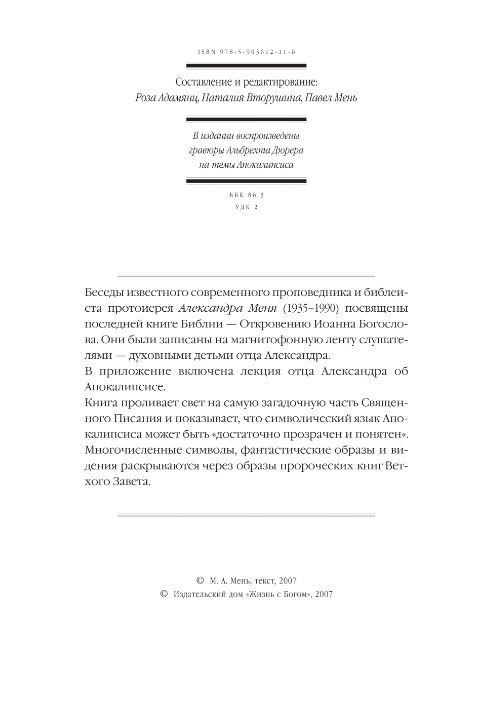 Беседы известного современного проповедника и библеиста протоиерея Александра Меня (1935-1990) посвящены последней книге Библии - Откровению Иоанна Богослова. Они были записаны на магнитофонную ленту слушателями - духовными детьми отца Александра.В приложение включена лекция отца Александра об Апокалипсисе.