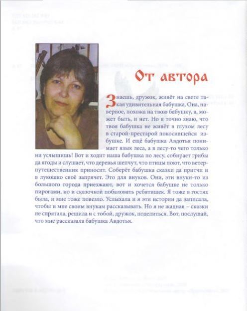 Живет на свете такая удивительная бабушка. Она, наверно, похожа на твою бабушку, а может быть, и нет. Но я точно знаю, что твоя бабушка не живет в глухом лесу в старой-престарой покосившейся избушке. И еще бабушка Авдотья понимает язык леса, а в лесу-то чего только ни услышишь! Вот и ходит наша бабушка по лесу, собирает грибы да ягоды и слушает, что деревья шепчут, что птицы поют, что ветер-путешественник приносит. Соберет бабушка сказки да притчи и в лукошко своё запрячет. Это для внуков. Они, эти внуки-то из большого города приезжают, вот и хочется бабушке не только пирогами, но и сказочками побаловать ребятишек