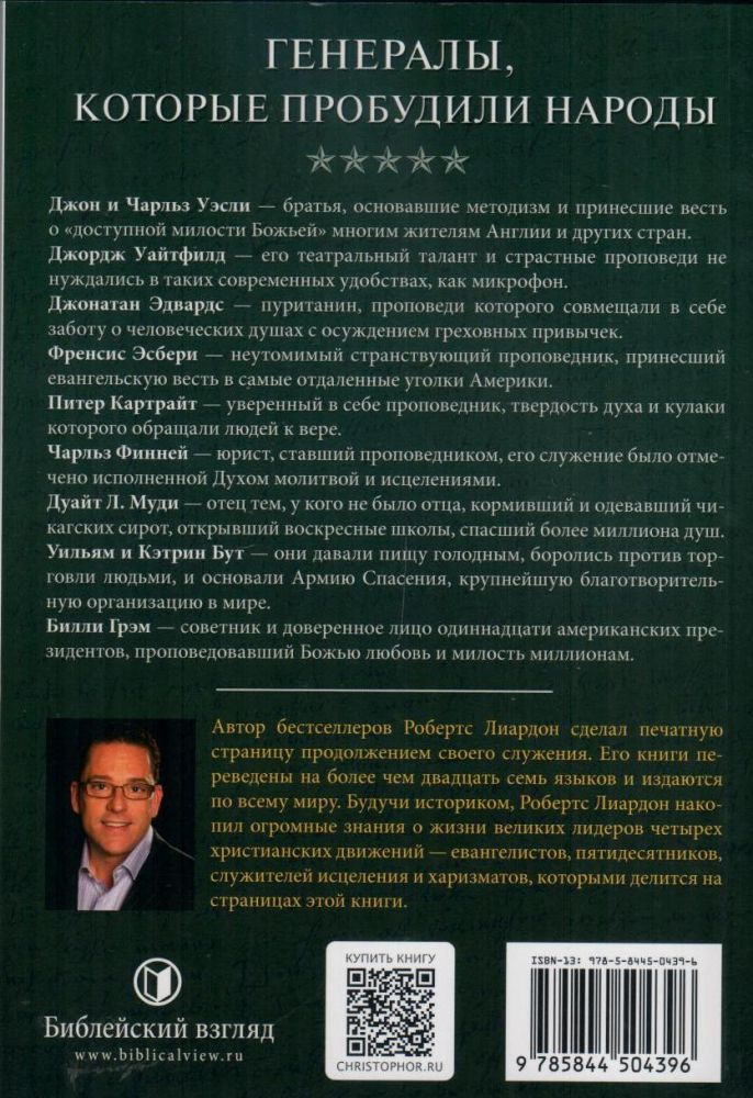 Эта книга напрямую обращается к нашему разуму и сердцу, рисуя историческую и теологическую перспективу величайших деяний Божьих. Точно так же, как книги вдохновляли Джона Уэсли и Джорджа Уитфилда искать Бога, чтение кратких очерков, посвященных Божьим генералам, вдохновит вас стремиться к тому же. Робертс Лиардон подарил нам еще один бестселлер - написанный понятным языком, но с академической точностью. И я искренне советую вам ознакомиться с этой книгой. —
