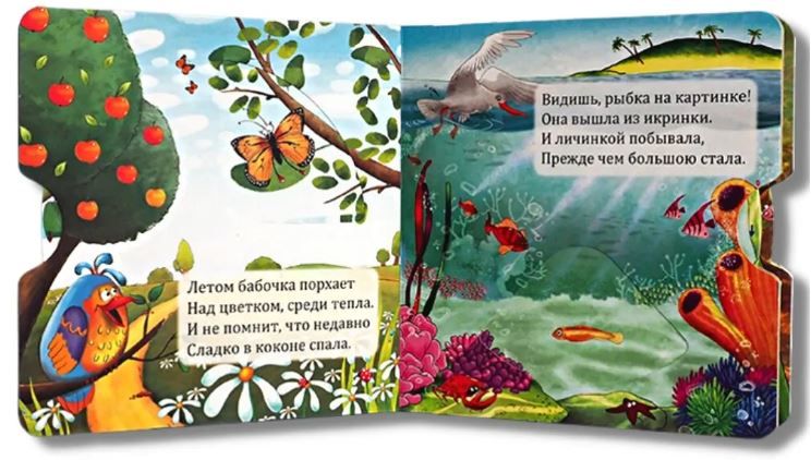 Эта интерактивная книга наглядно рассказывает о жизненных циклах бабочки, жука, рыбы, лягушки, фасоли, медузы, грибов, курицы и тюльпана. С помощью книги ребенок развивает мелкую моторику, узнает интересные факты о природе и в игровой форме приучается к чтению.