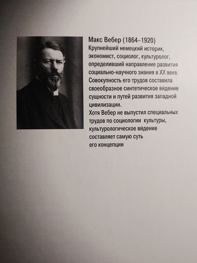 Макс Вебер (1864—1920) — немецкий социолог, историк, экономист. Его труды во многом определили направление развития социально-научного знания в XX в. Совокупность трудов М. Вебера составила как оригинальную концепцию социологии, так и своеобразное синтетическое видение сущности и путей развития западной цивилизации. Хотя Вебер не выпустил специальных трудов по социологии культуры, культурологическое видение составляет самую суть его концепции.
