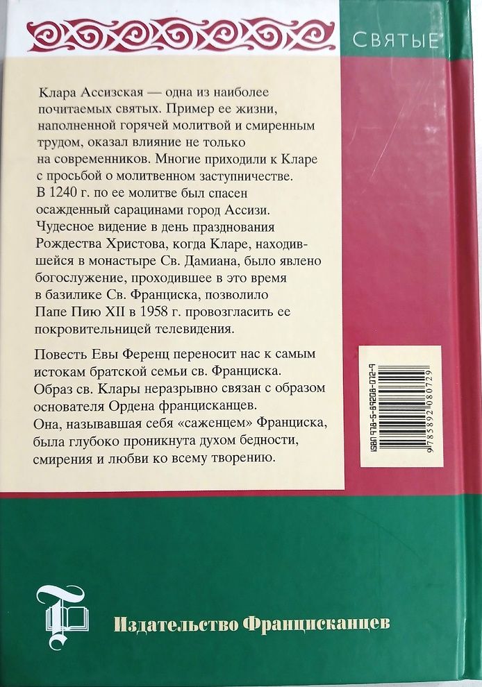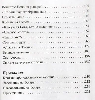 Предлагаемая вниманию читателя книга повествует о жизни святой Клары Ассизской (1193 — 1253), вместе со святым Франциском стоявшей у истоков великой францисканской семьи. Живой, доступный язык книги, свободная повествовательная манера делают образ святой более близким современному человеку и позволяют глубже понять дух Франциска и Клары, исполненный бедности, смирения и любви.