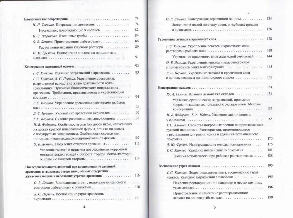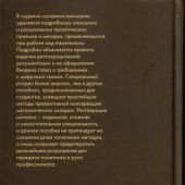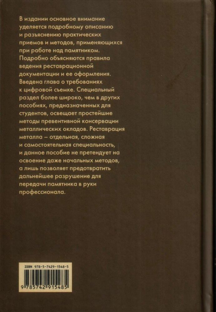 Специальный раздел более широко, чем в других пособиях, предназначенных для студентов, освещает простейшие методы превентивной консервации металлических окладов. Реставрация металла - отдельная, сложная и самостоятельная специальность, и данное пособие не претендует на освоение даже начальных методов, а лишь позволяет предотвратить дальнейшее разрушение для передачи памятника в руки профессионала.
