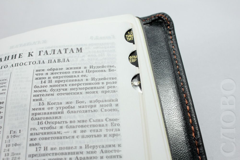 Переплет гибкий, выполнен из улучшенной кожи. Обрез окрашен «золотом». Имеются закладка и индексы для удобного поиска.