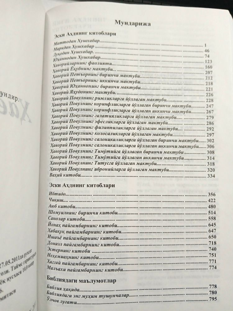 Новый Завет + 11 книг Ветхого Завета на современном узбекском языке.