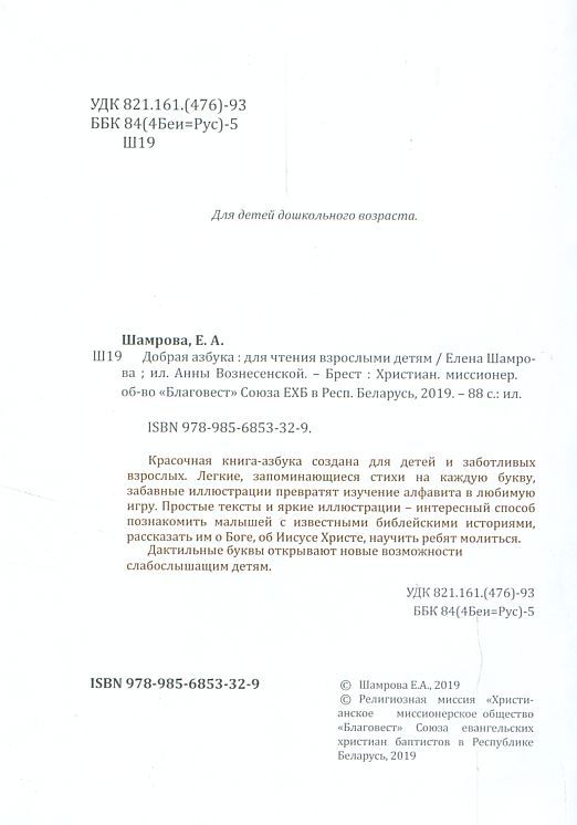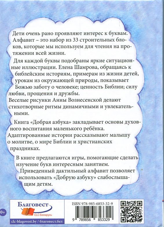 «Добрая азбука» может стать любимой книгой малыша и поможет не только выучить все буквы алфавита, но вместе с буквами начать постигать основы Христового учения: познакомит с библейскими героями, научит правильно поступать в различных жизненных ситуациях. Легкие, запоминающиеся стихи расскажут и про радость дружбы, и о правильном отношении к окружающим, и о роли Бога в нашей жизни.