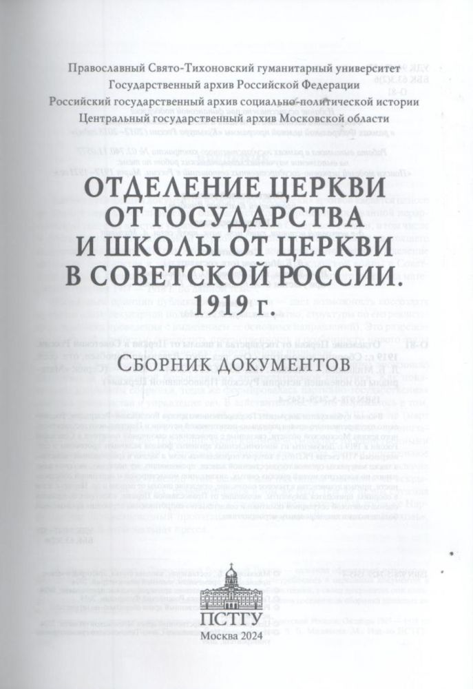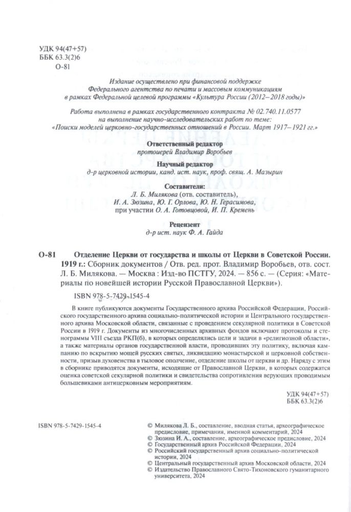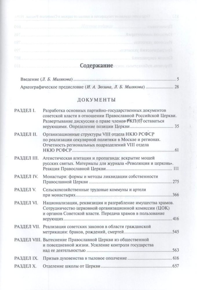 В книге публикуются документы Государственного архива Российской Федерации, Российского государственного архива социально-политической истории и Центрального государственного архива Московской области, посвященные разработке и реализации политики по отделению Православной Российской Церкви от государства и школы от церкви в Советской России в октябре 1917–1918 г. Документы из многочисленных архивных фондов посвящены проблемам создания советского государственного аппарата по реализации секулярной политики, формированию соответствующей декретивно-законодательной базы, практике проведения этой политики в центре и на местах, включая национализацию монастырской и церковной собственности, организацию системы гражданского брака, введение гражданской метрикации, обеспечение призыва духовенства в тыловое ополчение, запреты на преподавание Закона Божия в школе и закрытие церковных учебных заведений и т.д. Наряду с этими материалами в сборнике приводятся документы Священного Собора Православной Российской Церкви 1917–1918 гг., содержащие оценку секулярной политики Советской власти, свидетельства роста сопротивления верующих проводимой большевиками антицерковной политики. Для студентов духовных и светских учебных заведений и всех интересующихся церковной историей.