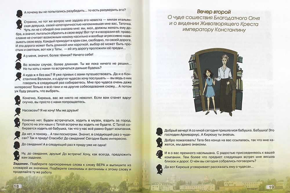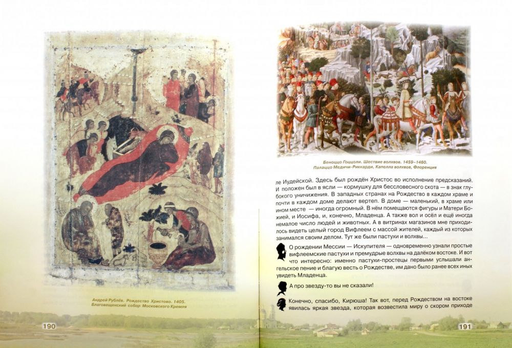 Читатели вместе с героями книги отправятся в увлекательное путешествие по дороге, ведущей к Храму. Познакомятся с важнейшими христианскими понятиями, библейскими притчами, узнают об истории создания памятников искусства. В книге представлен богатый иллюстративный материал: картины и фрески известных художников, фотографии знаменитых храмов, наиболее почитаемые иконы.